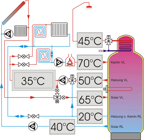 (der Rücklauf zum Heizkessel erhält vorgewärmtes Wasser aus dem